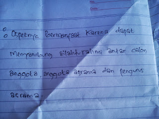 Tegang.. Deg-degan.. Takut.. Menggigil.. Gemetaran.. Jengkel.. Haru.. Sampai pengen nangis.. Itulah yang dirasakan para calon-calon penghuni AMKT RR saat menjalani masa orientasi penghuni yang dilaksanakan pada hari Minggu (06 Oktober 2013) di ruang makan asrama. Kenapa perlu diadakan masa orientasi ? Ya selayaknya siswa yang ingin masuk SMA, tentu akan menjalani MOS (masa orientasi siswa) dan mahasiswa baru yang akan menjalani OSPEK (orientasi pengenalan kampus ), Asrama juga perlu mengadakan kegiatan demikian, hal itu bertujuan mengajak para penghuni baru untuk lebih mengenal asrama yang akan menjadi tempat tinggal mereka nantinya. Selain itu, kegiatan ini juga bertujuan untuk melihat seberapa besar keingininan calon-calon penghuni untuk tinggal disini dan apa kontribusi yang akan mereka berikan kepada asrama ini. Tapi ada hal yang berbeda antara masa orientasi di sekolah dengan di asrama. Kalau di sekolah, siswa akan menjalani MOS setelah dinyatakan LULUS di sekolah tersebut. Kalau di Asrama Ruhui ? Ya bisa ditebak sendiri :)